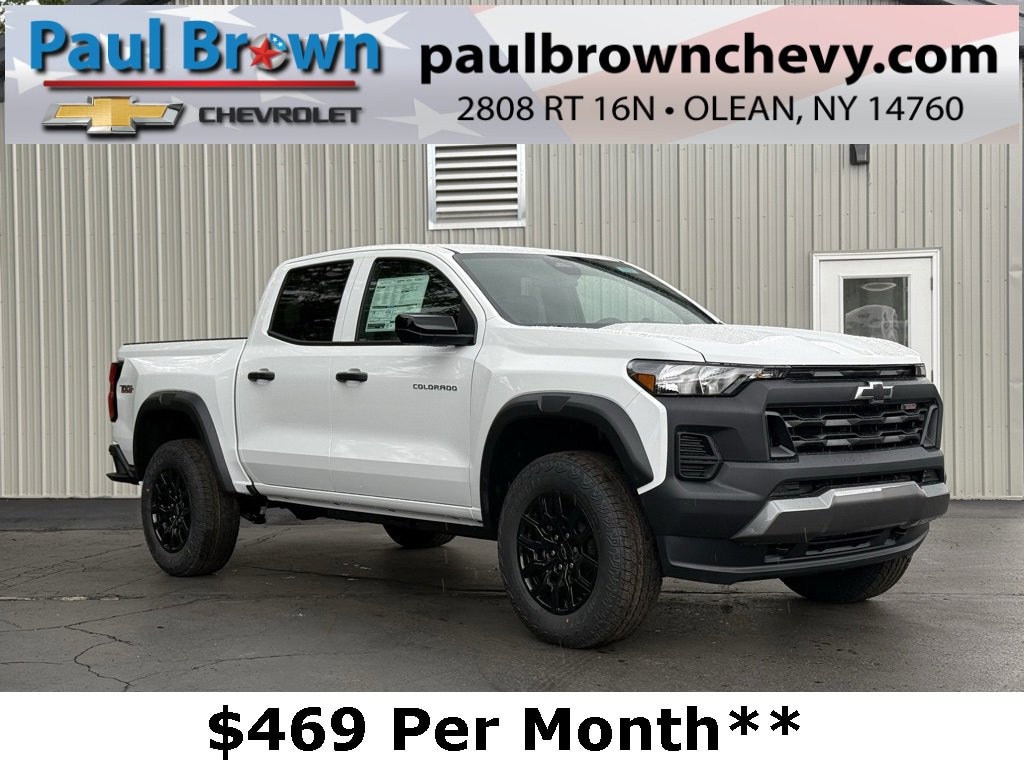Our For The People Pricing means ZERO price increases at Paul Brown! 2026 Chevrolet Colorado Trail Boss 4D Crew Cab Summit White 2.7L I4 Turbocharged DOHC 16V LEV3-ULEV50 310hp 8-Speed Automatic 4WD **$469 Per month 36 month 30,000 total mile lease plan. $1,500 plus tax and First payment Due at signing. Lease Loyalty or Lease Conquest Rebate qualification needed, 4-Spoke Wrapped Steering Wheel, 8-Way Power Driver Seat Adjuster, Apple CarPlay/Android Auto, Driver & Front Passenger Heated Seats, Emergency communication system: OnStar, Evotex Seat Trim, Following Distance Indicator, Forward Collision Alert, Front dual zone A/C, Front Pedestrian & Bicyclist Braking, Heated door mirrors, Heated Steering Wheel, Lane Keep Assist w/Lane Departure Warning, Low tire pressure warning, Navigation System, Power door mirrors, Power Driver Lumbar Control Seat Adjuster, Rear window defroster, Remote Vehicle Starter System, SiriusXM w/360L Trial Subscription, Trail Boss Convenience Package II, Wheels: 18 x 8.5 Black High Gloss Aluminum, Wireless Phone Charging. Final Price may require vehicle trade in and Paul Brown trade assistance , see website for details. For a hassle free purchase experience, reach out to the Sales team at Paul Brown Chevy at (716) 244-6077. Conveniently located on Route 16 North, Olean NY 14760. We are worth the trip! Travel from over 75 miles away and don't purchase we will supply you with $25 gas card! Paul Brown Chevy, A Dealer For the People!