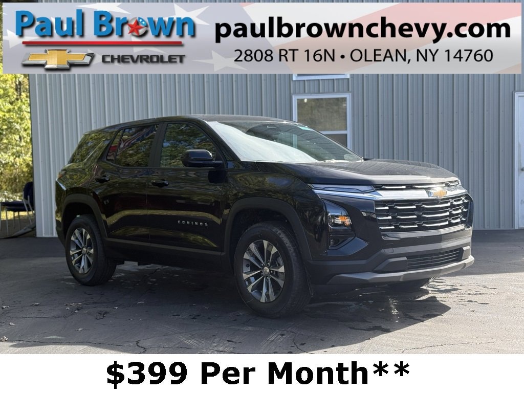 Our For The People Pricing means ZERO price increases at Paul Brown! 2026 Chevrolet Equinox LT 4D Sport Utility Mosaic Black Metallic 1.5L DOHC 8-Speed Automatic AWD **$399 Per month 36 month 30,000 total mile lease plan. $1,500 plus tax and First payment Due at signing. Lease Loyalty or Lease Conquest Rebate qualification needed., 2-Way Power Driver Lumbar Control Seat Adjuster, AutoSense Hands-Free Power Programmable Liftgate, Driver 8-Way Power Seat Adjuster, Dual-Zone Automatic Climate Control, Emergency communication system: OnStar and Chevrolet connected services capable, Evotex Seat Trim, Front Fog Lamps, Fully automatic headlights, HD Surround Vision, Heated door mirrors, Heated front seats, Heated steering wheel, Heated Wiper Park, Low tire pressure warning, Power door mirrors, Premium audio system: Chevrolet Infotainment 3, Rear Pedestrian Alert, Rear window defroster, Safety & Technology Package, SiriusXM w/360L Trial Subscription, Traffic Sign Recognition, Wheels: 17 Grazen Metallic Machined-Face Aluminum, Wireless Phone Charging for Portable Devices. 24/29 City/Highway MPG Final Price may require vehicle trade in and Paul Brown trade assistance , see website for details. For a hassle free purchase experience, reach out to the Sales team at Paul Brown Chevy at (716) 244-6077. Conveniently located on Route 16 North, Olean NY 14760. We are worth the trip! Travel from over 75 miles away and don't purchase we will supply you with $25 gas card! Paul Brown Chevy, A Dealer For the People!