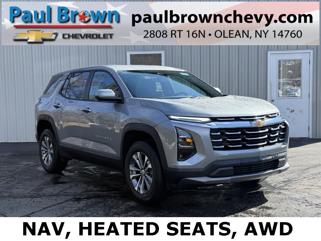 Our For The People Pricing means ZERO price increases at Paul Brown! 2026 Chevrolet Equinox LT 4D Sport Utility Sterling Gray Metallic 1.5L DOHC 8-Speed Automatic AWD Air Conditioning, Cloth Seat Trim, Emergency communication system: OnStar and Chevrolet connected services capable, Fully automatic headlights, Heated door mirrors, Heated Driver and Front Passenger Seats, Heated steering wheel, Low tire pressure warning, Navigation System, Power door mirrors, Premium audio system: Chevrolet Infotainment 3, Rear window defroster, Remote keyless entry, SiriusXM with 360L Trial Subscription, Wheels: 17 Grazen Metallic Machined-Face Aluminum. 25/29 City/Highway MPG Final Price may require vehicle trade in and Paul Brown trade assistance , see website for details. For a hassle free purchase experience, reach out to the Sales team at Paul Brown Chevy at (716) 244-6077. Conveniently located on Route 16 North, Olean NY 14760. We are worth the trip! Travel from over 75 miles away and don't purchase we will supply you with $25 gas card! Paul Brown Chevy, A Dealer For the People!