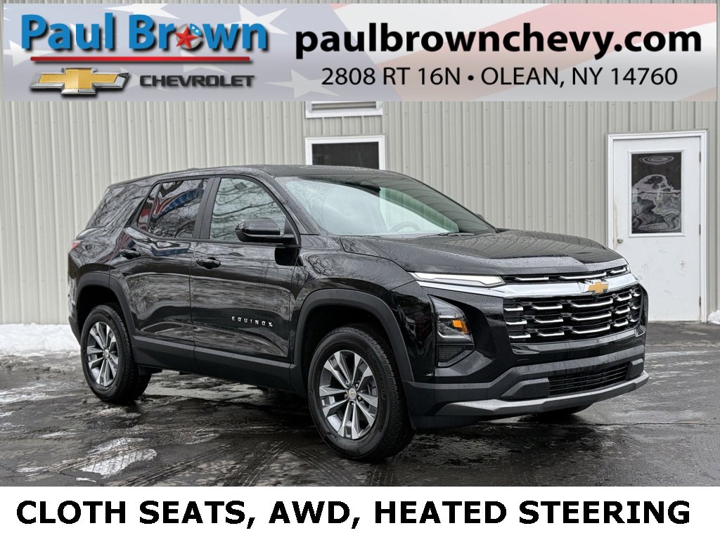 Our For The People Pricing means ZERO price increases at Paul Brown! 2026 Chevrolet Equinox LT 4D Sport Utility Mosaic Black Metallic 1.5L DOHC 8-Speed Automatic AWD Air Conditioning, Cloth Seat Trim, Emergency communication system: OnStar and Chevrolet connected services capable, Heated door mirrors, Heated front seats, Heated steering wheel, Low tire pressure warning, Power door mirrors, Premium audio system: Chevrolet Infotainment 3, Rear window defroster, SiriusXM with 360L Trial Subscription, Wheels: 17 Grazen Metallic Machined-Face Aluminum. 25/29 City/Highway MPG Final Price may require vehicle trade in and Paul Brown trade assistance , see website for details. For a hassle free purchase experience, reach out to the Sales team at Paul Brown Chevy at (716) 244-6077. Conveniently located on Route 16 North, Olean NY 14760. We are worth the trip! Travel from over 75 miles away and don't purchase we will supply you with $25 gas card! Paul Brown Chevy, A Dealer For the People!