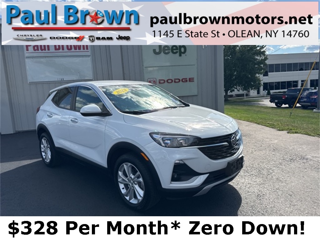 Priced below KBB Fair Purchase Price! Clean CARFAX. 2023 Buick Encore GX Preferred 4D Sport Utility Summit White ECOTEC 1.3L Turbo AWD 9-Speed Automatic *$328 per month / Zero cash or trade down / tax not included / 84 months and must qualify for top tier, 2 USB Ports w/Auxiliary Input Jack, 2-Way Power Driver Lumbar Control, 8-Way Power Driver Seat Adjuster, Air Conditioning, Automatic temperature control, Cold Weather Comfort Package, Emergency communication system: OnStar and Buick connected services capable, Enhanced Performance 6-Speaker System, Fully automatic headlights, Heated door mirrors, Heated Driver & Front Passenger Seats, Low tire pressure warning, Power door mirrors, Radio: 8" Diagonal Buick Infotainment System, Rear window defroster, Remote Vehicle Starter System, SiriusXM Radio, Wheels: 18" Bright Silver Painted Aluminum, Wireless Apple CarPlay/Wireless Android Auto. 26/29 City/Highway MPG Final Price may require vehicle trade in and Paul Brown trade assistance , see website for details. For a hassle free purchase experience, reach out to the Sales team at Paul Brown Chevy at (716) 244-6077. Conveniently located on Route 16 North, Olean NY 14760. We are worth the trip! Travel from over 75 miles away and don't purchase we will supply you with $25 gas card! Paul Brown Chevy, A Dealer For the People! Our For The People Pricing means ZERO price increases at Paul Brown.