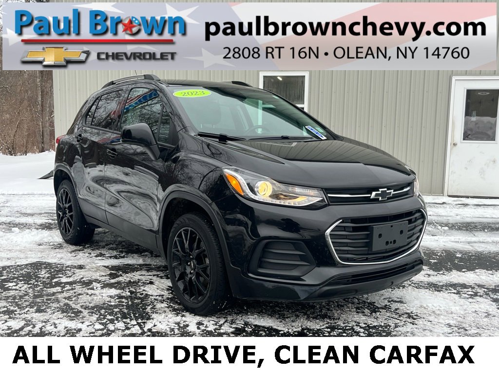 CARFAX One-Owner. Clean CARFAX. 2022 Chevrolet Trax LT 4D Sport Utility Mosaic Black Metallic Turbo 1.4L VVT DOHC 4-Cylinder DI SIDI 6-Speed Automatic AWD 2 USB Ports w/Auxiliary Input Jack, 6-Way Power Driver Seat Adjuster, Air Conditioning, Electronic Stability Control, Emergency communication system: OnStar and Chevrolet connected services capable, Exterior Parking Camera Rear, Fully automatic headlights, Heated door mirrors, Keyless Open, Keyless Start, Power door mirrors, Rear window defroster, Remote keyless entry, SiriusXM Radio, Wheels: 18 Gloss Black Aluminum. 23/30 City/Highway MPG Final Price may require vehicle trade in and Paul Brown trade assistance , see website for details. For a hassle free purchase experience, reach out to the Sales team at Paul Brown Chevy at (716) 244-6077. Conveniently located on Route 16 North, Olean NY 14760. We are worth the trip! Travel from over 75 miles away and don't purchase we will supply you with $25 gas card! Paul Brown Chevy, A Dealer For the People!