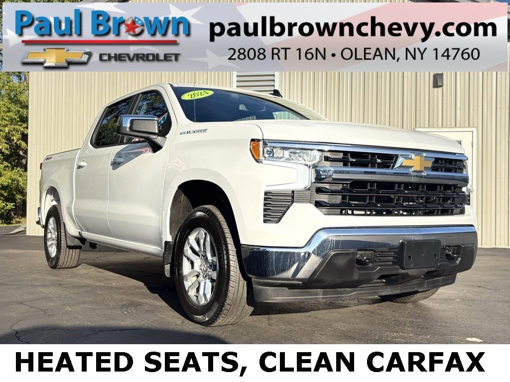 Priced below KBB Fair Purchase Price! CARFAX One-Owner. Clean CARFAX. 2024 Chevrolet Silverado 1500 LT 4D Crew Cab Summit White 2.7L I4 Turbocharged DOHC 16V LEV3-SULEV30 310hp 8-Speed Automatic 4WD 12.3 Multicolor Reconfigurable Digital Display, 120-Volt Bed Mounted Power Outlet, 120-Volt Interior Power Outlet, Auto-Locking Rear Differential, Chevrolet Connected Access Capable, Cloth Seat Trim, Dual-Zone Automatic Climate Control, Electric Rear-Window Defogger, Following Distance Indicator, Forward Collision Alert, Front Pedestrian Braking, Fully automatic headlights, HD Rear Vision Camera, Heated door mirrors, Heated front seats, Heated steering wheel, Hitch Guidance, IntelliBeam Automatic High Beam On/Off, Lane Keep Assist w/Lane Departure Warning, Low tire pressure warning, OnStar & Chevrolet Connected Services Capable, Power door mirrors, Remote keyless entry, Remote Vehicle Starter System, SiriusXM w/360L, Steering Wheel Audio Controls, Wheels: 18 x 8.5 Bright Silver Painted Aluminum, Wi-Fi Hot Spot Capable. Final Price may require vehicle trade in and Paul Brown trade assistance , see website for details. For a hassle free purchase experience, reach out to the Sales team at Paul Brown Chevy at (716) 244-6077. Conveniently located on Route 16 North, Olean NY 14760. We are worth the trip! Travel from over 75 miles away and don't purchase we will supply you with $25 gas card! Paul Brown Chevy, A Dealer For the People!