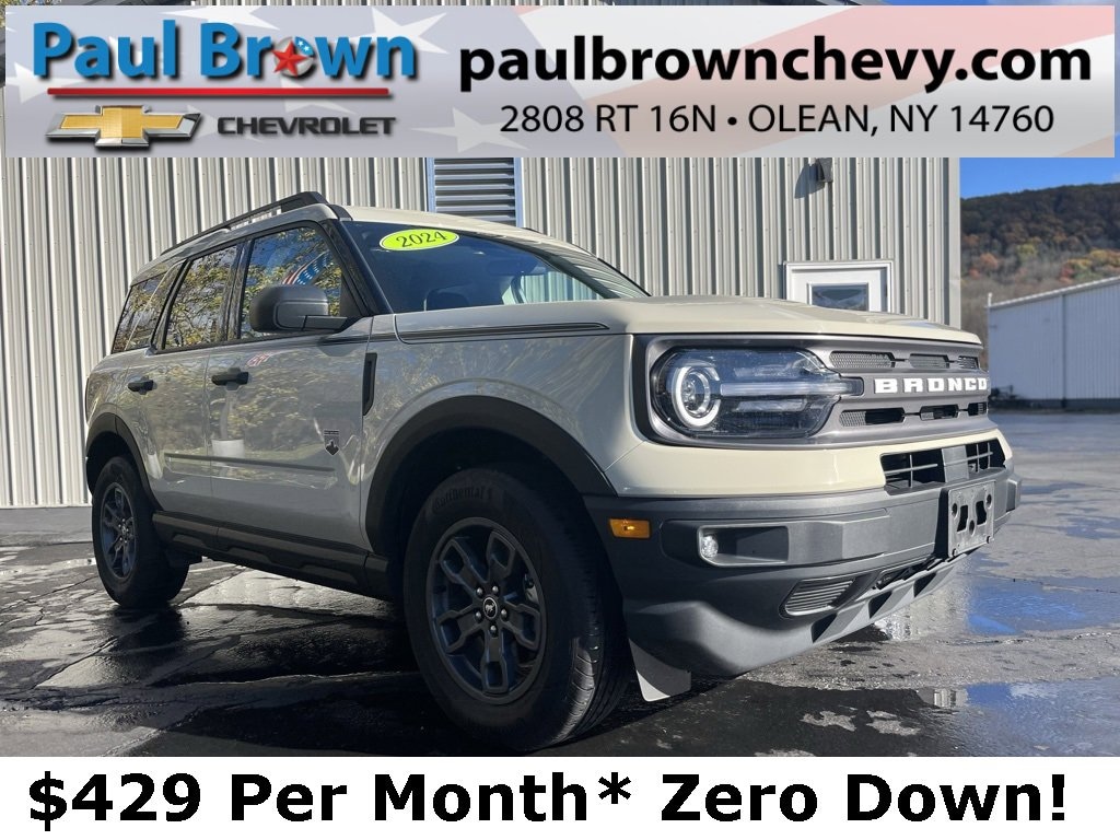 Priced below KBB Fair Purchase Price! CARFAX One-Owner. 2024 Ford Bronco Sport Big Bend 4D Sport Utility Desert Sand 1.5L EcoBoost 8-Speed Automatic 4WD Odometer is 4397 miles below market average! *$429 per month / Zero cash or trade down / tax not included / 84 months and must qualify for top tier APR, Air Conditioning, Automatic temperature control, Emergency communication system: SYNC 3 911 Assist, Evasive Steering Assist, Ford Co-Pilot360 Assist+, Fully automatic headlights, Heated door mirrors, Heated Front Bucket Seats, Intelligent Adaptive Cruise Control w/Stop & Go, Low tire pressure warning, Power door mirrors, Rear window defroster, SYNC 3 Communications & Entertainment System, Topo Graphic Package, Unique Cloth Front Bucket Seats, Voice-Activated Touchscreen Navigation System. 25/29 City/Highway MPG Final Price may require vehicle trade in and Paul Brown trade assistance , see website for details. For a hassle free purchase experience, reach out to the Sales team at Paul Brown Chevy at (716) 244-6077. Conveniently located on Route 16 North, Olean NY 14760. We are worth the trip! Travel from over 75 miles away and don't purchase we will supply you with $25 gas card! Paul Brown Chevy, A Dealer For the People!
