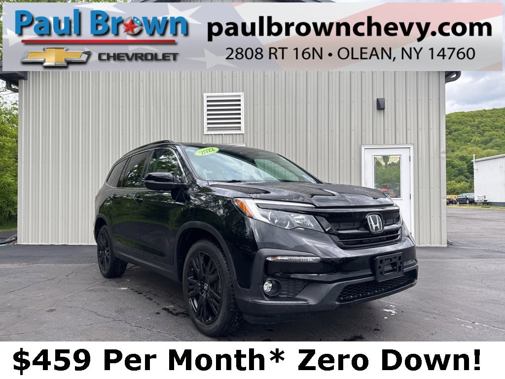 Priced below KBB Fair Purchase Price! Clean CARFAX. 2022 Honda Pilot Special Edition 4D Sport Utility Crystal Black Pearl 3.5L V6 24V SOHC i-VTEC 9-Speed Automatic AWD *$459 per month / Zero cash or trade down / tax not included / 84 months and must qualify for top tier APR, Apple CarPlay/Android Auto, Blind Spot Information (BSI) System warning, Emergency communication system: HondaLink Assist, Exterior Parking Camera Rear, Forward collision: Collision Mitigation Braking System (CMBS) + FCW mitigation, Front dual zone A/C, Fully automatic headlights, Heated door mirrors, Heated front seats, Lane departure: Lane Keeping Assist System (LKAS) active, Leather Seat Trim, Low tire pressure warning, Memory seat, Power door mirrors, Power driver seat, Power Liftgate, Power moonroof, Power passenger seat, Rear air conditioning, Rear window defroster. 19/26 City/Highway MPG Final Price may require vehicle trade in and Paul Brown trade assistance , see website for details. For a hassle free purchase experience, reach out to the Sales team at Paul Brown Chevy at (716) 244-6077. Conveniently located on Route 16 North, Olean NY 14760. We are worth the trip! Travel from over 75 miles away and don't purchase we will supply you with $25 gas card! Paul Brown Chevy, A Dealer For the People!