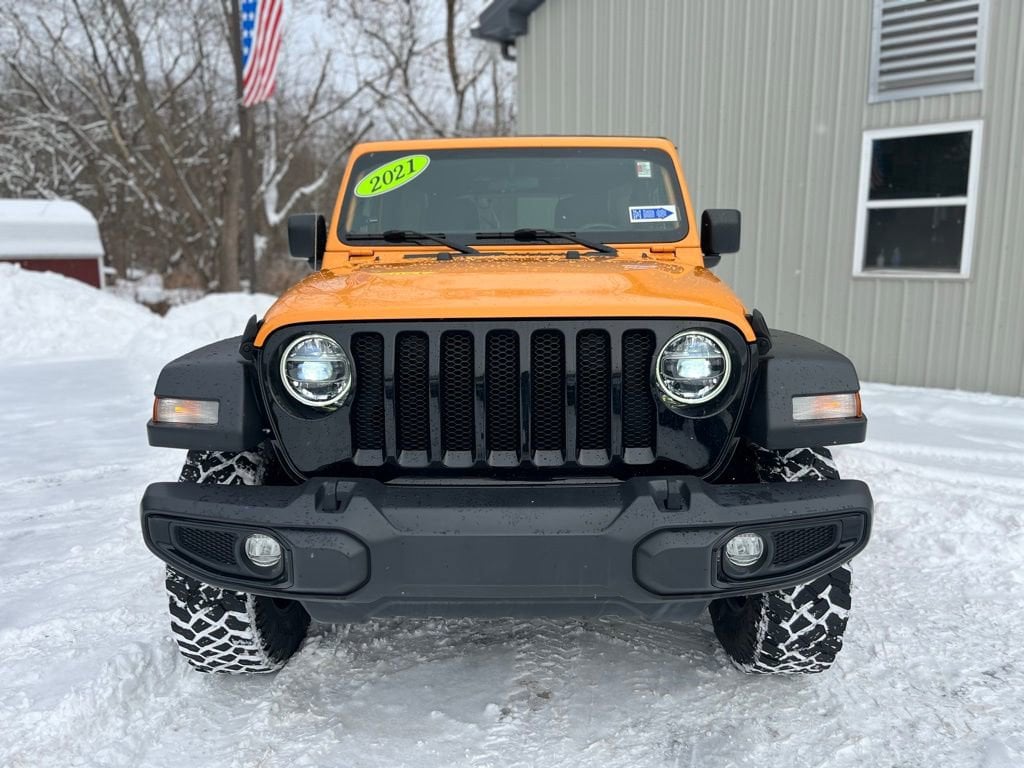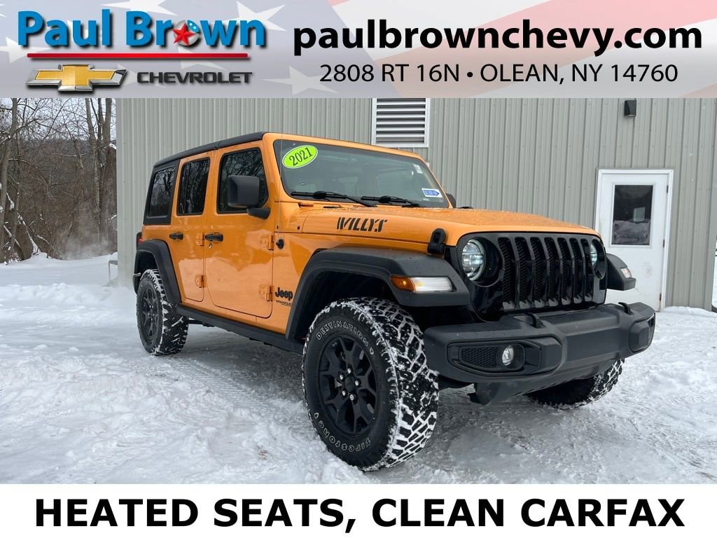 Priced below KBB Fair Purchase Price! CARFAX One-Owner. Clean CARFAX. 2021 Jeep Wrangler Unlimited Willys 4D Sport Utility Nacho Clearcoat 2.0L I4 DOHC 8-Speed Automatic 4WD Odometer is 2336 miles below market average! Air Conditioning w/Auto Temperature Control, Anti-Spin Differential Rear Axle, Apple CarPlay, Cloth Low-Back Bucket Seats, Cold Weather Group, For More Info, Call 800-643-2112, Heated Front Seats, Heated Steering Wheel, Integrated roll-over protection, Low tire pressure warning, ParkView Rear Back-Up Camera, Power Heated Mirrors, Rear Window Defroster, Remote Keyless Entry, SiriusXM Radio Service, SiriusXM Satellite Radio, Universal Garage Door Opener. Final Price may require vehicle trade in and Paul Brown trade assistance , see website for details. For a hassle free purchase experience, reach out to the Sales team at Paul Brown Chevy at (716) 244-6077. Conveniently located on Route 16 North, Olean NY 14760. We are worth the trip! Travel from over 75 miles away and don't purchase we will supply you with $25 gas card! Paul Brown Chevy, A Dealer For the People!