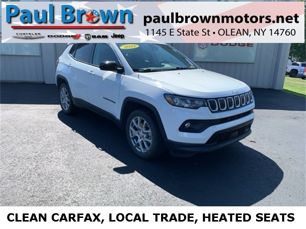 CARFAX One-Owner. Clean CARFAX. 2022 Jeep Compass Latitude Lux 4D Sport Utility Bright White Clearcoat 2.4L I4 4WD 9-Speed 948TE Automatic Air Conditioning, Emergency communication system: SiriusXM Guardian, Fully automatic headlights, Heated door mirrors, Heated front seats, Heated steering wheel, Leather Trimmed Bucket Seats, Low tire pressure warning, ParkView Rear Back-Up Camera, Power door mirrors, Power driver seat, Rear window defroster, Wheels: 18" x 7.0" Painted Aluminum. 22/30 City/Highway MPG Final Price may require vehicle trade in and Paul Brown trade assistance , see website for details. For a hassle free purchase experience, reach out to the Sales team at Paul Brown Chevy at (716) 244-6077. Conveniently located on Route 16 North, Olean NY 14760. We are worth the trip! Travel from over 75 miles away and don't purchase we will supply you with $25 gas card! Paul Brown Chevy, A Dealer For the People! Our For The People Pricing means ZERO price increases at Paul Brown.