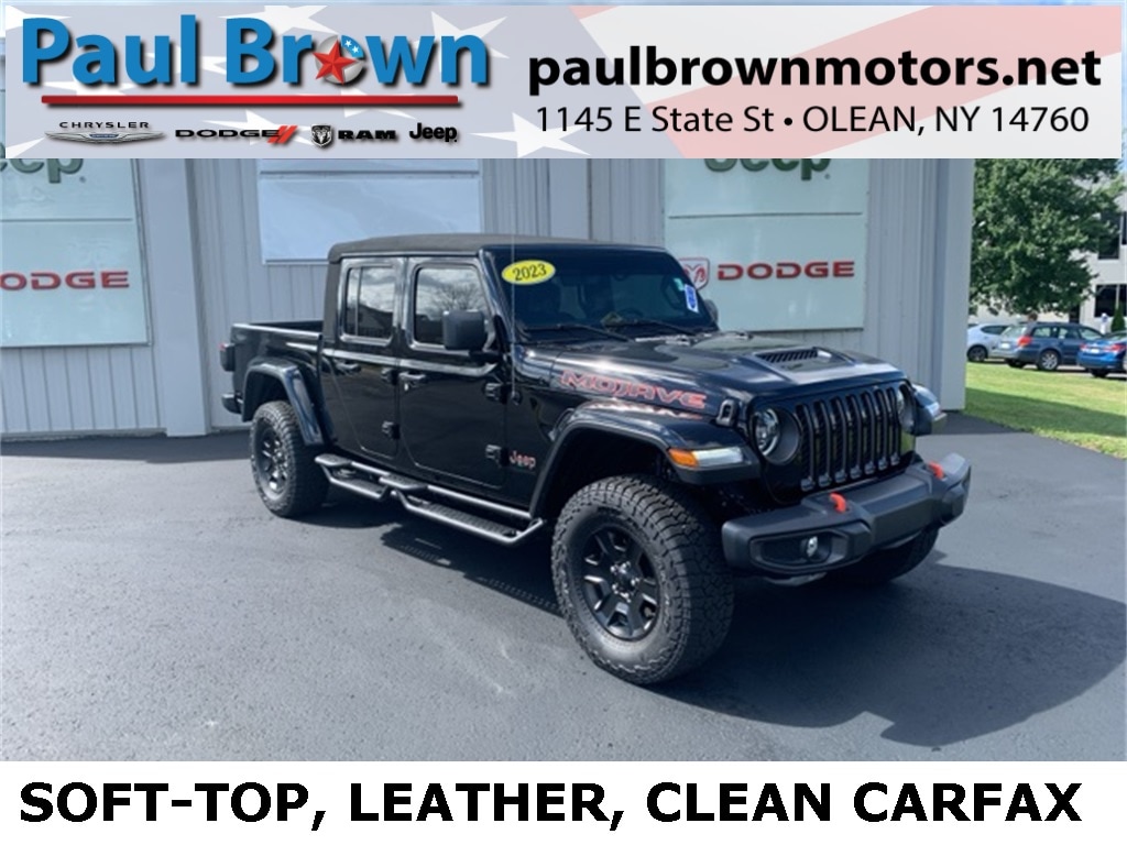Priced below KBB Fair Purchase Price! CARFAX One-Owner. Clean CARFAX. 2023 Jeep Gladiator Mojave 4D Crew Cab Black Clearcoat Odometer is 12815 miles below market average! 3.6L V6 24V VVT 4WD 8-Speed Automatic Apple CarPlay/Android Auto, Blind Spot & Cross Path Detection, Class IV Receiver Hitch, Front dual zone A/C, Fully automatic headlights, Heated door mirrors, Heated Front Seats, Heated Steering Wheel, Integrated roll-over protection, Low tire pressure warning, MOPAR Black Perforated Leather Upgrade, MOPAR Spray In Bedliner, Navigation System/GPS/Navi, ParkSense Rear Park Assist System, ParkView Rear Back-Up Camera, Power door mirrors, Premium Black Sunrider Soft Top, Remote keyless entry, Wheels: 17" x 7.5" Low Gloss Black Aluminum. Final Price may require vehicle trade in and Paul Brown trade assistance , see website for details. For a hassle free purchase experience, reach out to the Sales team at Paul Brown Chevy at (716) 244-6077. Conveniently located on Route 16 North, Olean NY 14760. We are worth the trip! Travel from over 75 miles away and don't purchase we will supply you with $25 gas card! Paul Brown Chevy, A Dealer For the People! Our For The People Pricing means ZERO price increases at Paul Brown.