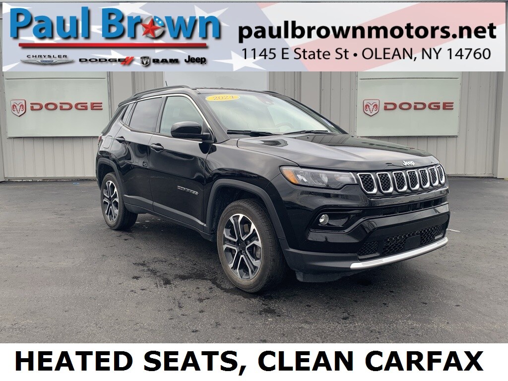 Priced below KBB Fair Purchase Price! CARFAX One-Owner. Clean CARFAX. 2024 Jeep Compass Limited 4D Sport Utility Diamond Black Crystal Pearlcoat Odometer is 2898 miles below market average! 2.0L I4 DOHC 4WD 8-Speed Automatic Balance of new car warranty., 4G LTE Wi-Fi Hot Spot, Emergency communication system: Jeep Connect, Front dual zone A/C, Front fog lights, Heated door mirrors, Heated front seats, Heated steering wheel, Leather steering wheel, Leatherette Seats, Low tire pressure warning, ParkView Rear Back-Up Camera, Power door mirrors, Power driver seat, Power windows, Rain sensing wipers, Remote keyless entry, Speed control, Wheels: 18" x 7" Painted Diamond Cut Aluminum. 24/32 City/Highway MPG Final Price may require vehicle trade in and Paul Brown trade assistance, see website for details. For a hassle free purchase experience, reach out to the Sales team at Paul Brown Motors at (585-376-5057). Conveniently located on E State Street, Olean NY 14760. We are worth the trip! Travel from over 75 miles away and don't purchase we will supply you with $25 gas card! Paul Brown Chevy, A Dealer For the People! Our For The People Pricing means ZERO price increases at Paul Brown.