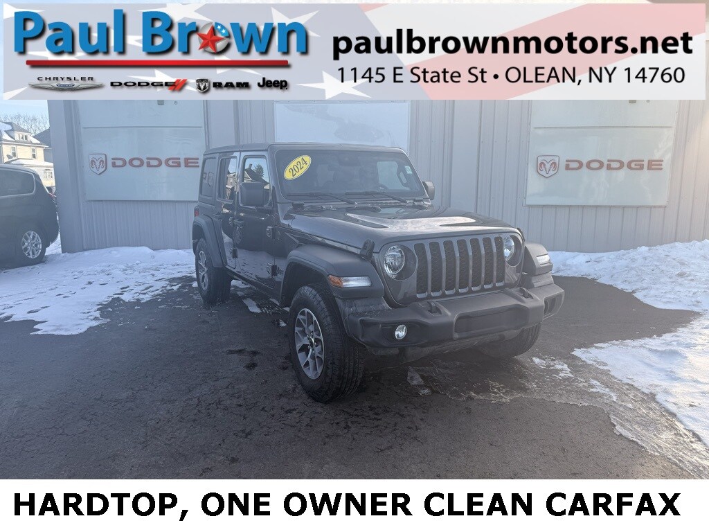 Priced below KBB Fair Purchase Price! CARFAX One-Owner. Clean CARFAX. 2024 Jeep Wrangler Sport S 4D Sport Utility Granite Crystal Metallic Clearcoat Odometer is 13127 miles below market average! 2.0L I4 DOHC 4WD 8-Speed Automatic Balance of new car warranty., Local Trade, Sold and serviced right here at Paul Brown., 2-Door Passive Entry, Front Door Locks, Advanced Brake Assist, Air Conditioning w/Auto Temperature Control, Air Filtering, Apple CarPlay/Android Auto, Automatic Headlamps, Black 3-Piece Hard Top, Cluster 7.0" TFT Color Display, Convenience Group, Corning Gorilla Glass, Deep Tint Sunscreen Windows, Emergency/Assistance Call, Enhanced Adaptive Cruise Control, Freedom Panel Storage Bag, Front 1-Touch Down Power Windows, Front fog lights, Full Speed Forward Collision Warning Plus, Heated Front Seats, Heated Steering Wheel, No Soft Top, ParkView Rear Back-Up Camera, Power Heated Mirrors, Premium Wrapped Steering Wheel, Quick Order Package 22S Sport S, Rear Window Defroster, Rear Window Wiper/Washer, Remote Keyless Entry, Remote Start System, Security Alarm, Speed Sensitive Power Locks, Sport S, Sun Visors w/Illuminated Vanity Mirrors, Universal Garage Door Opener, Wheels: 17" x 7.5" Gray. Final Price may require vehicle trade in and Paul Brown trade assistance, see website for details. For a hassle free purchase experience, reach out to the Sales team at Paul Brown Motors at (585-376-5057). Conveniently located on E State Street, Olean NY 14760. We are worth the trip! Travel from over 75 miles away and don't purchase we will supply you with $25 gas card! Paul Brown Chevy, A Dealer For the People! Our For The People Pricing means ZERO price increases at Paul Brown.