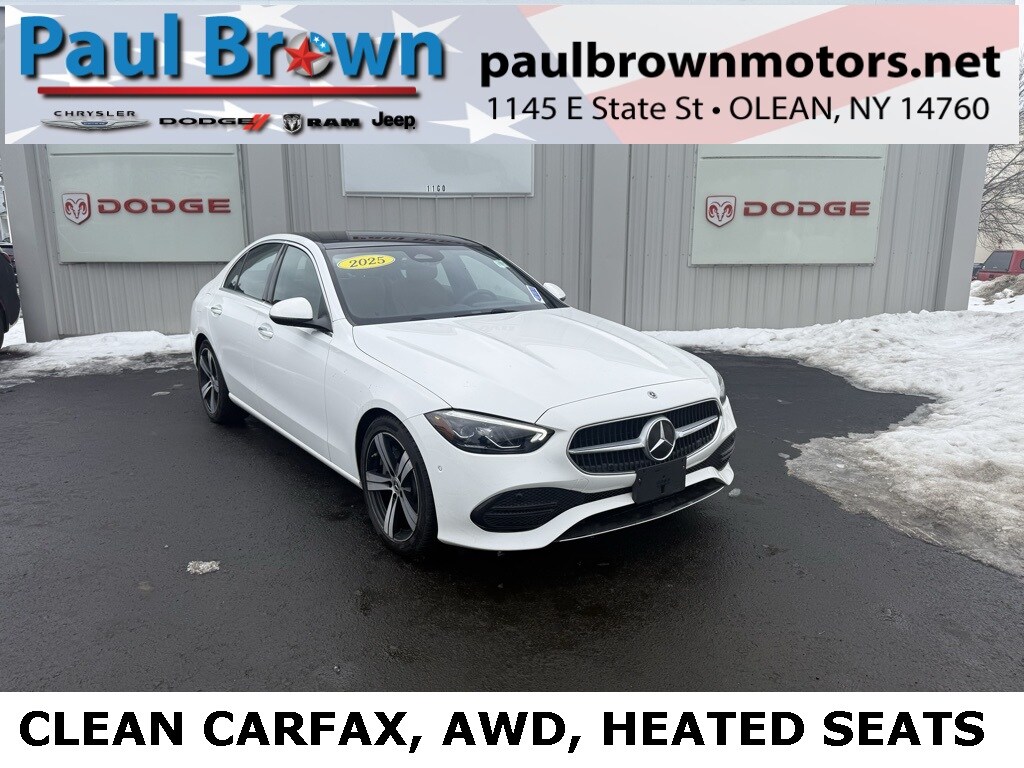 CARFAX One-Owner. Clean CARFAX. 2025 Mercedes-Benz C-Class C 300 4MATIC® 4D Sedan Polar White 2.0L I4 Turbocharged 4MATIC® 9-Speed Automatic 11.9" Center Touchscreen Display, 18" 5-Spoke Wheels, Apple CarPlay®/Android Auto®, Auto tilt-away steering wheel, Emergency communication system: Mercedes-Benz Emergency Call Service, Exterior Parking Camera Rear, Front dual zone A/C, Fully automatic headlights, Heated door mirrors, Low tire pressure warning, Lumbar Support, MB-Tex Upholstery, Panorama Roof, Power door mirrors, Power driver seat, Power Heated Front Seats with Memory, Rain sensing wipers, Rear window defroster, SiriusXM Satellite Radio. 24/33 City/Highway MPG Final Price may require vehicle trade in and Paul Brown trade assistance, see website for details. For a hassle free purchase experience, reach out to the Sales team at Paul Brown Motors at (585-376-5057). Conveniently located on E State Street, Olean NY 14760. We are worth the trip! Travel from over 75 miles away and don't purchase we will supply you with $25 gas card! Paul Brown Chevy, A Dealer For the People! Our For The People Pricing means ZERO price increases at Paul Brown.