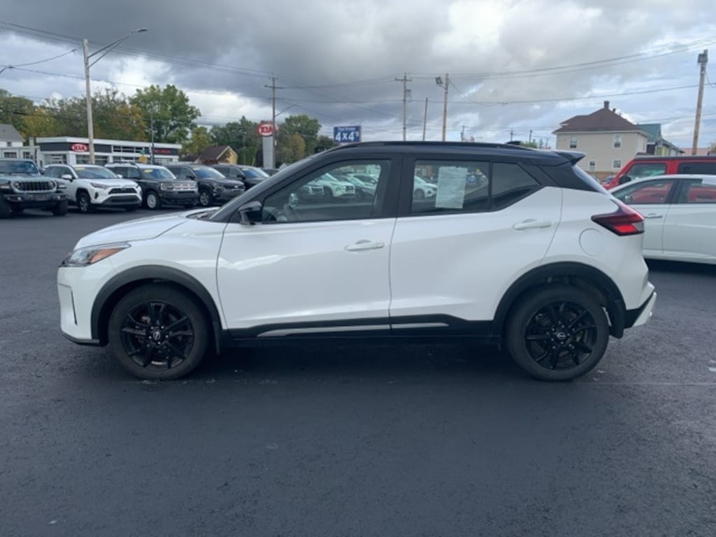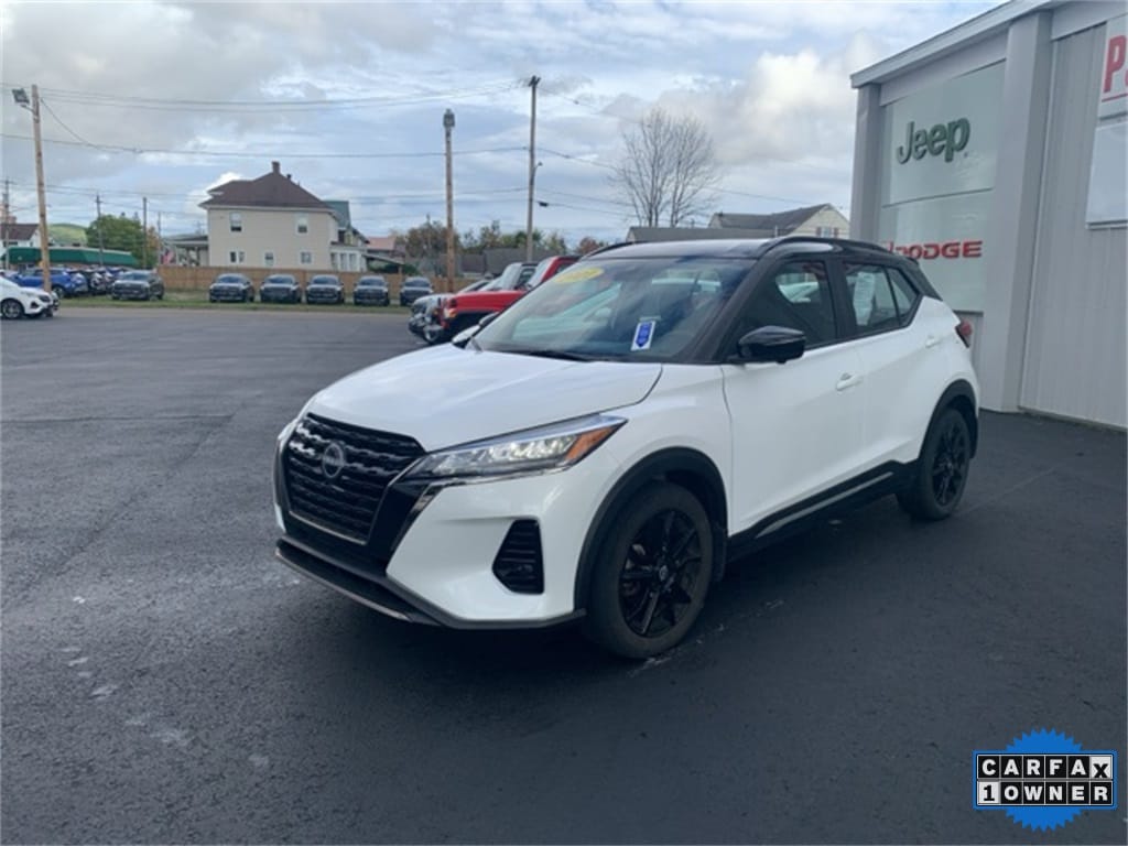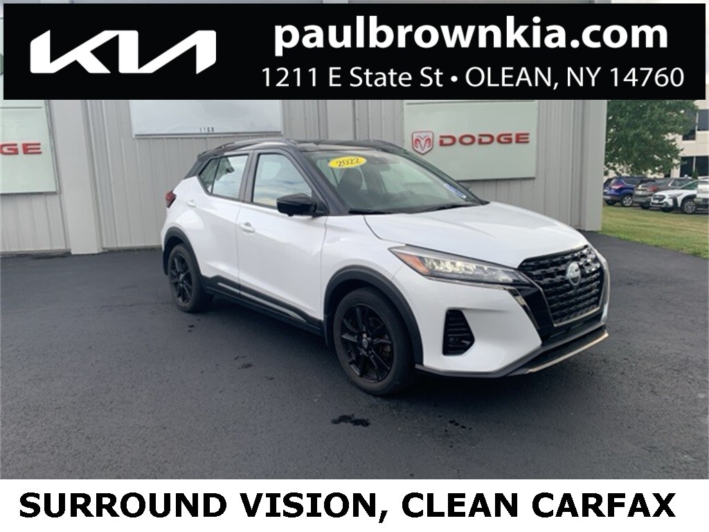 CARFAX One-Owner. Clean CARFAX. 2022 Nissan Kicks SR 4D Sport Utility Aspen White Tricoat/Super Black Odometer is 2770 miles below market average! 1.6L 4-Cylinder DOHC 16V FWD CVT with Xtronic Air Conditioning, Apple CarPlay/Android Auto, Automatic temperature control, Blind Spot Warning, Cloth Seat Trim, Exterior Parking Camera Rear, Fully automatic headlights, Heated door mirrors, Low tire pressure warning, Power door mirrors, Rear Parking Sensors, Rear window defroster, Remote keyless entry. 31/36 City/Highway MPG Final Price may require vehicle trade in and Paul Brown trade assistance , see website for details. For a hassle free purchase experience, reach out to the Sales team at Paul Brown Chevy at (716) 244-6077. Conveniently located on Route 16 North, Olean NY 14760. We are worth the trip! Travel from over 75 miles away and don't purchase we will supply you with $25 gas card! Paul Brown Chevy, A Dealer For the People! Our For The People Pricing means ZERO price increases at Paul Brown.