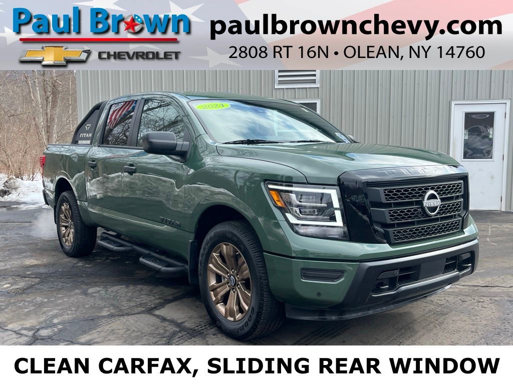 CARFAX One-Owner. Clean CARFAX. 2024 Nissan Titan SV 4D Crew Cab Tactical Green Metallic 5.6L V8 DOHC 32V LEV3-ULEV70 400hp 9-Speed Automatic 4WD Odometer is 2210 miles below market average! 120V/12V Outlets In Back Of Center Console, 2 Illuminated USB-A Ports In Back Of Center Console, Accessory Bronze Edition Floor Mats, Accessory Sport Bar, Accessory Utility Package, Auto-Dimming Rear-View Mirror, Black Center Console Cupholder Rings, Black Center I/P, Switch & Vent Finishers, Black Driver & Front Passenger I/P Finishers, Black Front Bumper, Black Headliner & A-Pillar, Black Utility Mirror, Blind Spot Warning, Bronze Center Console Finishers, Bronze Door Finishers, Bronze Steering Wheel Finishers, Bronze TITAN Emblem On Front Doors, Bumper Step, Dedicated Cell Phone Holder, Drop In Bed Liner, Dual Illuminated Vanity Mirror Front Sun Visors, Dual Zone Automatic HVAC, Front & Rear Parking Sensors, Front Door TITAN Emblem Delete, Full LED Headlamp, Gloss Black Front Grille Surround, Heated Front Captain's Chairs, Intelligent Key System, Leather-Wrapped Steering Wheel, Low tire pressure warning, Mood Light, NissanConnect Services, Overhead Console w/Sunglass Holder, Power Sliding Rear Window w/Defogger, Rear HVAC Vents, Rear window defroster, Remote Engine Start System, Special Liftgate Emblem Treatments, SV Bronze Edition Package, SV Convenience Package, Trailer Hitch, Wheels: 20 x 8.0JJ Bronze, Wi-Fi Hotspot. Final Price may require vehicle trade in and Paul Brown trade assistance , see website for details. For a hassle free purchase experience, reach out to the Sales team at Paul Brown Chevy at (716) 244-6077. Conveniently located on Route 16 North, Olean NY 14760. We are worth the trip! Travel from over 75 miles away and don't purchase we will supply you with $25 gas card! Paul Brown Chevy, A Dealer For the People!