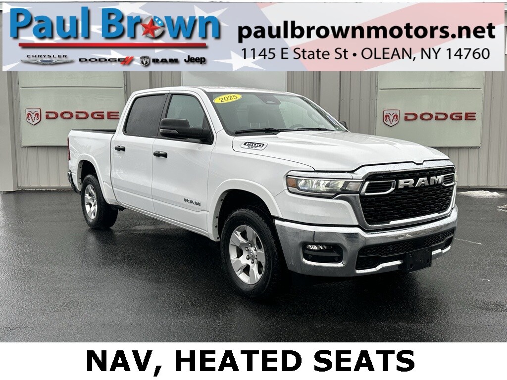 Priced below KBB Fair Purchase Price! CARFAX One-Owner. 2025 Ram 1500 Big Horn/Lone Star 4D Crew Cab Bright White Clearcoat 3.0L I6 4WD 8-Speed Automatic 115V Auxiliary Rear Power Outlet, 12" Touchscreen Display, 400W Inverter, 9 Amplified Speakers w/Subwoofer, Air Conditioning ATC w/Dual Zone Control, Apple CarPlay/Android Auto, Auto Power-Folding Mirrors, Big Horn Level 2 Equipment Group, Configurable Drive Mode, Front fog lights, Glove Box Lamp, Google Android Auto, GPS Navigation, Heated door mirrors, Heated Front Seats, Heated Steering Wheel, Integrated Voice Command w/Bluetooth, Leather Wrapped Steering Wheel, Low tire pressure warning, Media Hub w/2 Charge Only USBs, Overhead LED Lamps, ParkView Rear Back-Up Camera, Power 2-Way Driver Lumbar Adjust, Power Adjust 8-Way Driver Seat, Power Adjustable Pedals, Power windows, Premium Overhead Console, Radio: Uconnect 5 Nav w/12.0" Display, Rear Power Sliding Window, Rear Window Defroster, Remote Tailgate Release, Security Alarm, SiriusXM w/360L, Speed control, Steering Wheel Mounted Audio Controls, Universal Garage Door Opener, Wheels: 18" x 8" Cast-Aluminum Painted. Final Price may require vehicle trade in and Paul Brown trade assistance, see website for details. For a hassle free purchase experience, reach out to the Sales team at Paul Brown Motors at (585-376-5057). Conveniently located on E State Street, Olean NY 14760. We are worth the trip! Travel from over 75 miles away and don't purchase we will supply you with $25 gas card! Paul Brown Chevy, A Dealer For the People! Our For The People Pricing means ZERO price increases at Paul Brown.