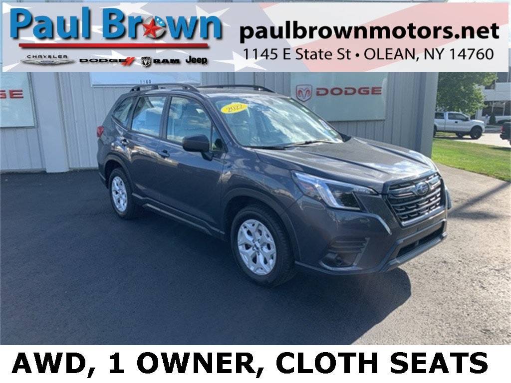 CARFAX One-Owner. 2022 Subaru Forester Base 4D Sport Utility Magnetite Gray Metallic Odometer is 6896 miles below market average! 2.5L 4-Cylinder DOHC 16V AWD Lineartronic CVT Air Conditioning, Automatic temperature control, Cloth Upholstery, Exterior Parking Camera Rear, Fully automatic headlights, Low tire pressure warning, Rear window defroster, STARLINK/Apple CarPlay/Android Auto. 26/33 City/Highway MPG Final Price may require vehicle trade in and Paul Brown trade assistance , see website for details. For a hassle free purchase experience, reach out to the Sales team at Paul Brown Chevy at (716) 244-6077. Conveniently located on Route 16 North, Olean NY 14760. We are worth the trip! Travel from over 75 miles away and don't purchase we will supply you with $25 gas card! Paul Brown Chevy, A Dealer For the People! Our For The People Pricing means ZERO price increases at Paul Brown.