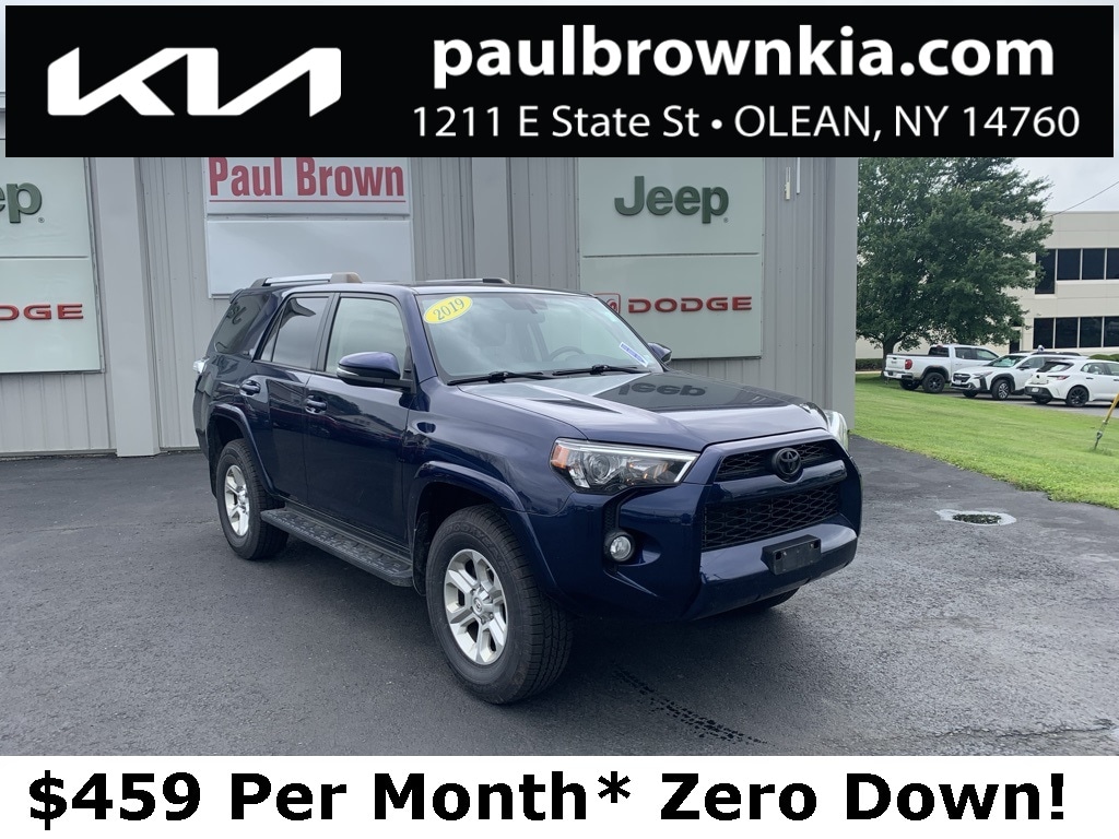 CARFAX One-Owner. Clean CARFAX. 2019 Toyota 4Runner SR5 Premium 4D Sport Utility Nautical Blue Metallic Odometer is 5938 miles below market average! 4.0L V6 SMPI DOHC 4WD 5-Speed Automatic with Overdrive 17" x 7.0" 6-Spoke Alloy Wheels, Air Conditioning, Electronic Stability Control, Emergency communication system: Safety Connect, Exterior Parking Camera Rear, Garage Door Opener, Garage door transmitter: HomeLink, Heated door mirrors, Heated Front Bucket Seats, Low tire pressure warning, Power door mirrors, Power driver seat, Power passenger seat, Rear window defroster, Remote keyless entry, Softex Synthetic Leather Seat Trim, Traction control. Final Price may require vehicle trade in and Paul Brown trade assistance , see website for details. For a hassle free purchase experience, reach out to the Sales team at Paul Brown Chevy at (716) 244-6077. Conveniently located on Route 16 North, Olean NY 14760. We are worth the trip! Travel from over 75 miles away and don't purchase we will supply you with $25 gas card! Paul Brown Chevy, A Dealer For the People! Our For The People Pricing means ZERO price increases at Paul Brown. Awards: