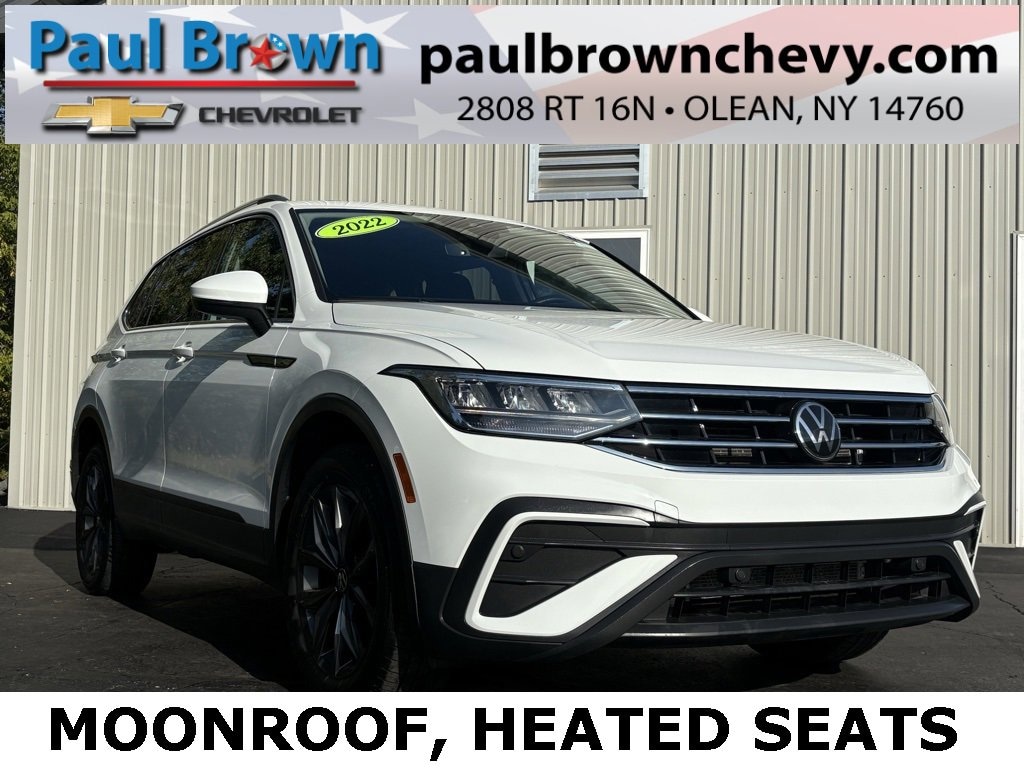 Priced below KBB Fair Purchase Price! CARFAX One-Owner. Clean CARFAX. 2022 Volkswagen Tiguan 2.0T SE 4D Sport Utility Pure White 2.0L TSI DOHC 8-Speed Automatic with Tiptronic AWD Odometer is 2531 miles below market average! Exterior Parking Camera Rear, Front dual zone A/C, Fully automatic headlights, Heated door mirrors, Heated front seats, Low tire pressure warning, Perforated V-Tex Leatherette Seating Surfaces, Power door mirrors, Power driver seat, Power Liftgate, Rain sensing wipers, Rear window defroster, Wheels: 18 Dark Graphite 10-Spoke Alloy. 22/29 City/Highway MPG Final Price may require vehicle trade in and Paul Brown trade assistance , see website for details. For a hassle free purchase experience, reach out to the Sales team at Paul Brown Chevy at (716) 244-6077. Conveniently located on Route 16 North, Olean NY 14760. We are worth the trip! Travel from over 75 miles away and don't purchase we will supply you with $25 gas card! Paul Brown Chevy, A Dealer For the People!